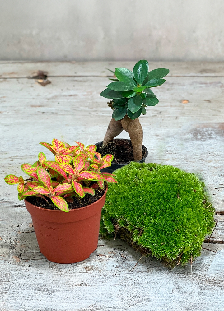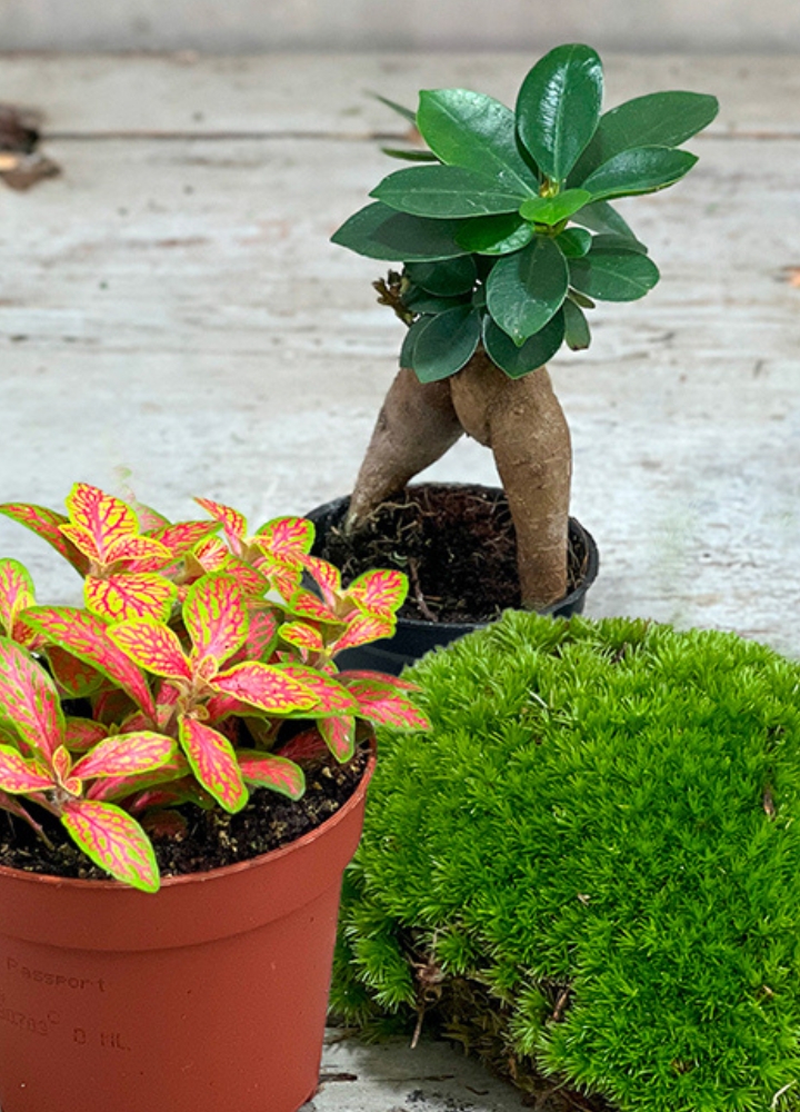 La Box contiene un Ficus Microcarpa, il muschio e una Fittonia, piantina tropicale colorata che ama gli ambienti umidi e dona vivacità al terrario.