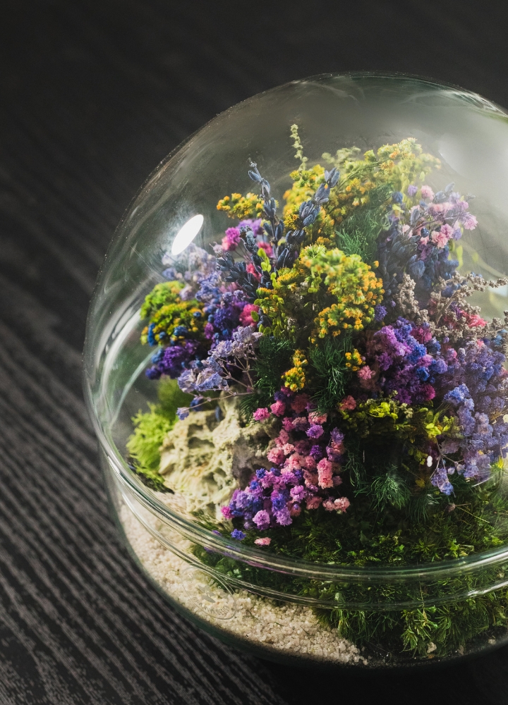 BIOSFERA M è un terrario artigianale dal particolare design sferico, pensato per evocare un piccolo mondo protetto, dove la Natura si conserva nel tempo senza bisogno di cure.