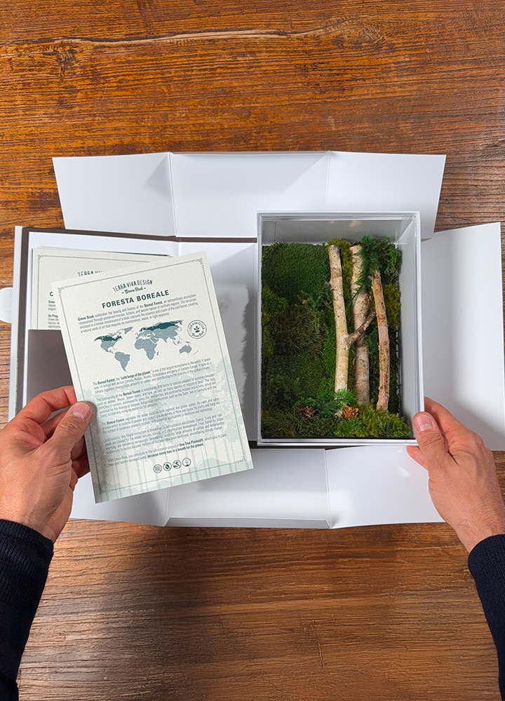 - All’interno eleganti schede illustrano le caratteristiche della collana Green Book, della Biodiversità della Foresta Boreale, del progetto One Tree Planted.