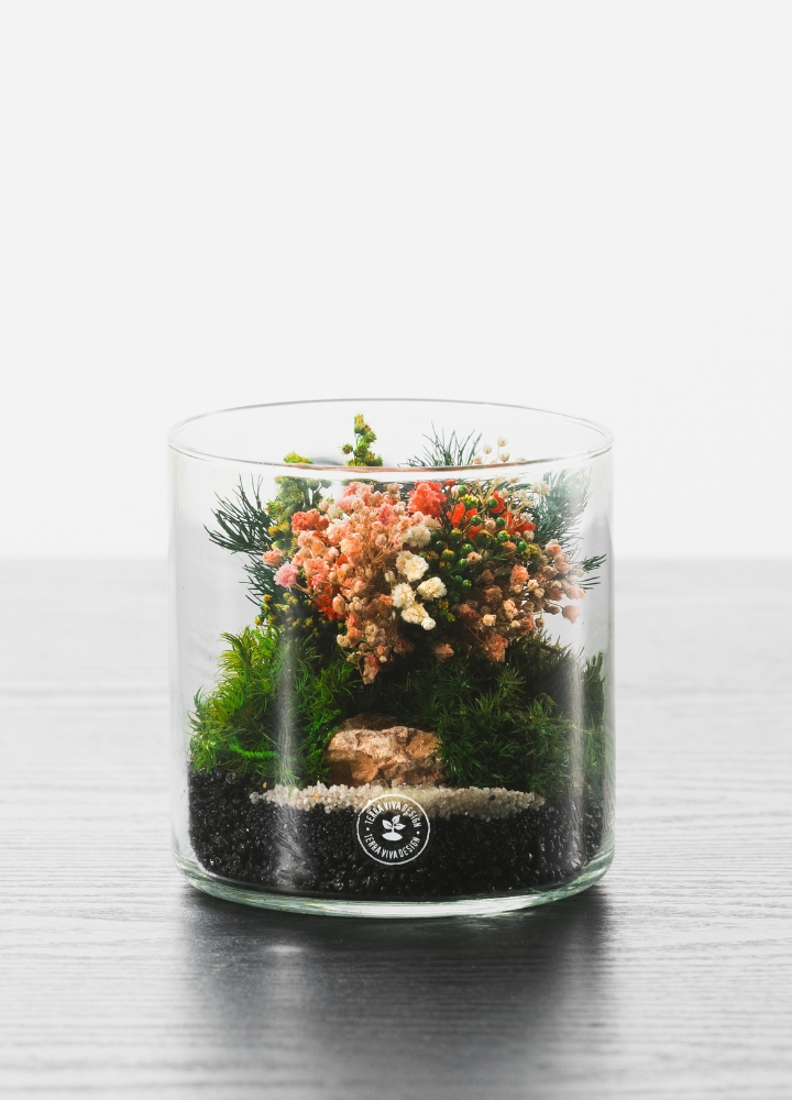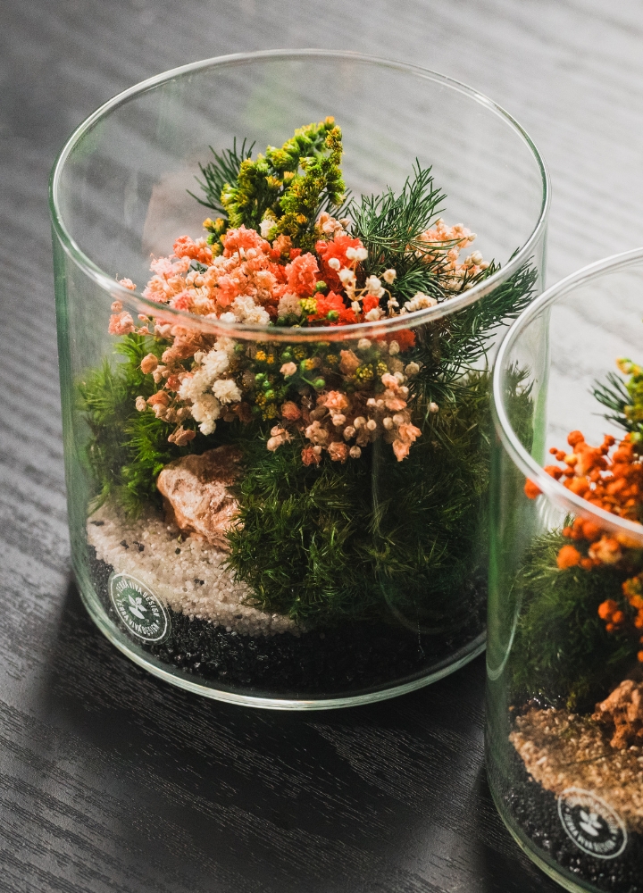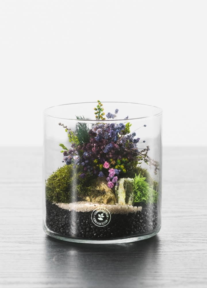 CILINDRO è un piccolo terrario artigianale dal design lineare realizzato a mano con piante vere stabilizzate all'interno di un piccolo vaso in vetro.