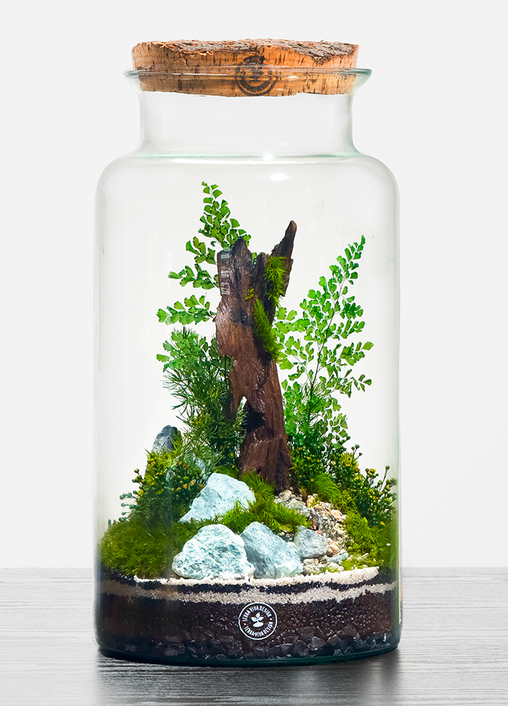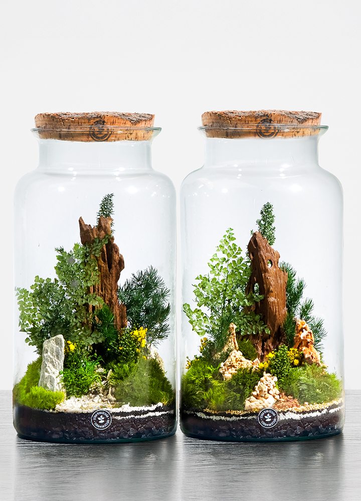 BYRON L BOSCO viene proposto con il caratteristico tappo in sughero, removibile, che completa l’estetica naturale dell’opera. Il terrario può essere conservato anche aperto, senza alterarne la bellezza o la durata.