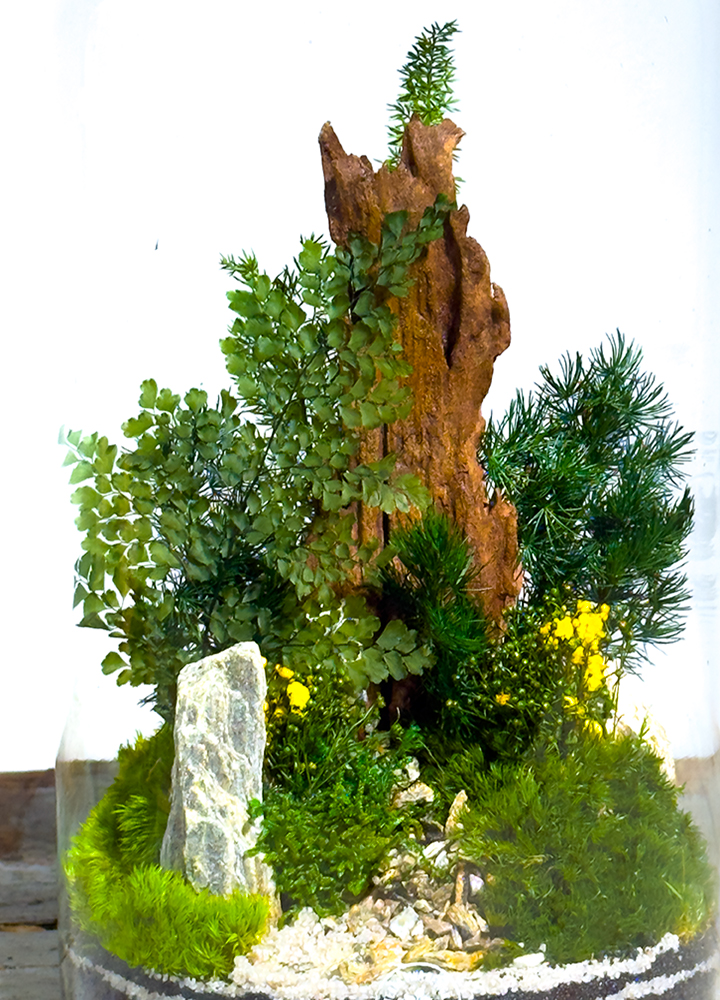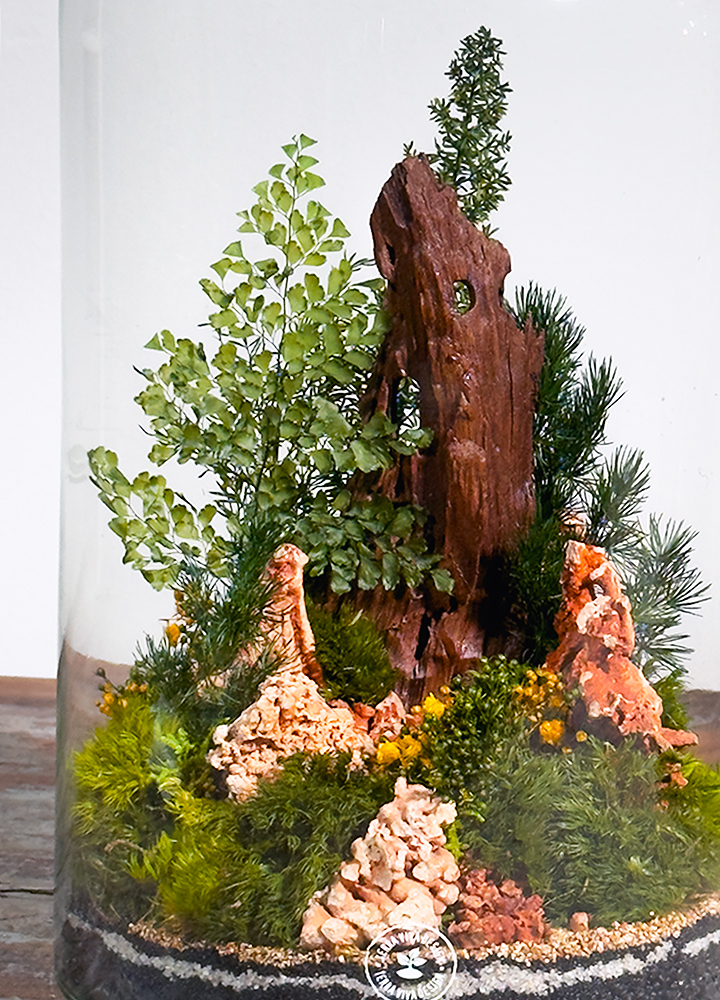 BYRON L BOSCO nasce da un design elegante, pulito e trasversale. Un paesaggio boschivo racchiuso nel vetro, realizzato con legno naturale, pietre, broom bloom, muschi e un boschetto in verde stabilizzato composto da Felce Nephrolepis, Asparagus, Gypsophila e Broom Bloom.